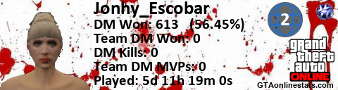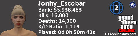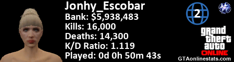 [URL=http://GTAonlinestats.com/showplayer/Jonhy_Escobar/2][IMG]http://GTAonlinestats.com/signature/Jonhy_Escobar/2/sig.png[/IMG][/URL]