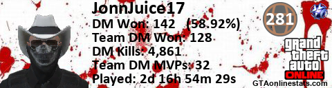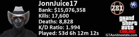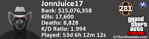 [URL=http://GTAonlinestats.com/showplayer/JonnJuice17][IMG]http://GTAonlinestats.com/dmsignature/JonnJuice17/sig.png[/IMG][/URL]