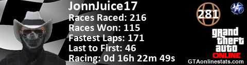 [URL=http://GTAonlinestats.com/showplayer/JonnJuice17][IMG]http://GTAonlinestats.com/racesignature/JonnJuice17/sig.png[/IMG][/URL]
