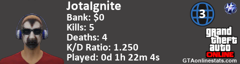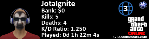 <a href="http://GTAonlinestats.com/showplayer/JotaIgnite"><img src="http://GTAonlinestats.com/dmsignature/JotaIgnite/sig.png" alt="JotaiGnite" border="0" /></a>
