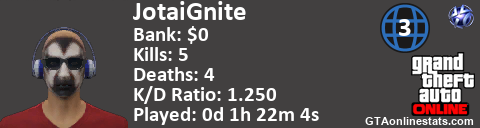 [URL=http://GTAonlinestats.com/showplayer/JotaiGnite][IMG]http://GTAonlinestats.com/signature/JotaiGnite/sig.png[/IMG][/URL]