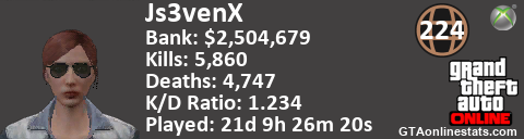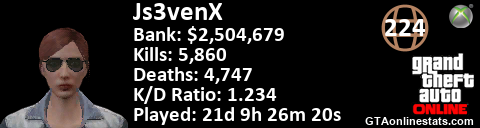 [URL=http://GTAonlinestats.com/showplayer/Js3venX][IMG]http://GTAonlinestats.com/signature/Js3venX/sig.png[/IMG][/URL]