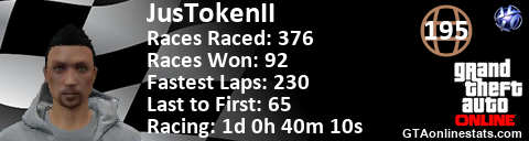 <a href="http://GTAonlinestats.com/showplayer/JusTokenII"><img src="http://GTAonlinestats.com/racesignature/JusTokenII/sig.png" alt="JusTokenII" border="0" /></a>