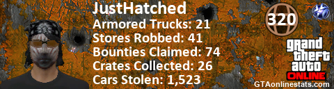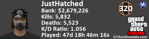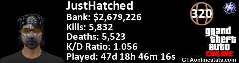 <a href="http://GTAonlinestats.com/showplayer/JustHatched"><img src="http://GTAonlinestats.com/signature/JustHatched/sig.png" alt="JustHatched" border="0" /></a>