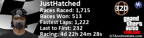 [URL=http://GTAonlinestats.com/showplayer/JustHatched][IMG]http://GTAonlinestats.com/racesignature/JustHatched/sig.png[/IMG][/URL]