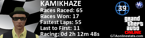 <a href="http://GTAonlinestats.com/showplayer/KAMIKHAZE"><img src="http://GTAonlinestats.com/racesignature/KAMIKHAZE/sig.png" alt="kamikhaze" border="0" /></a>