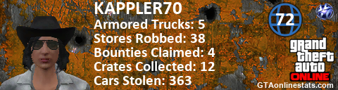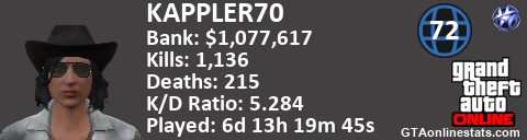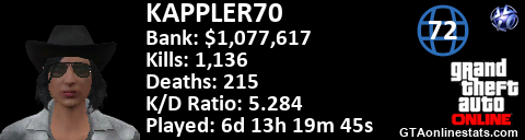 [URL=http://GTAonlinestats.com/showplayer/KAPPLER70][IMG]http://GTAonlinestats.com/signature/KAPPLER70/sig.png[/IMG][/URL]