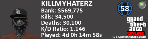 <a href="http://GTAonlinestats.com/showplayer/KILLMYHATERZ/2"><img src="http://GTAonlinestats.com/signature/KILLMYHATERZ/2/sig.png" alt="KILLMYHATERZ" border="0" /></a>