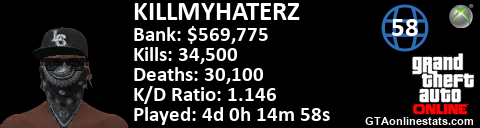 [URL=http://GTAonlinestats.com/showplayer/KILLMYHATERZ/2][IMG]http://GTAonlinestats.com/signature/KILLMYHATERZ/2/sig.png[/IMG][/URL]