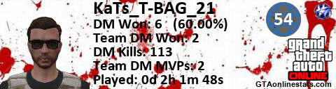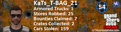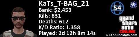 <a href="http://GTAonlinestats.com/showplayer/KaTs_T-BAG_21"><img src="http://GTAonlinestats.com/dmsignature/KaTs_T-BAG_21/sig.png" alt="KaTs_T-BAG_21" border="0" /></a>