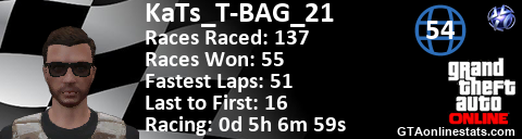 [URL=http://GTAonlinestats.com/showplayer/KaTs_T-BAG_21][IMG]http://GTAonlinestats.com/racesignature/KaTs_T-BAG_21/sig.png[/IMG][/URL]