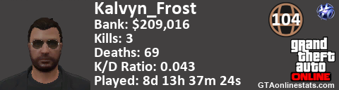 [URL=http://GTAonlinestats.com/showplayer/Kalvyn_Frost][IMG]http://GTAonlinestats.com/signature/Kalvyn_Frost/sig.png[/IMG][/URL]