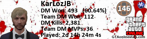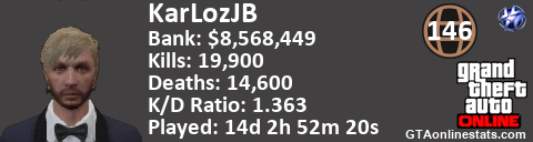 [URL=http://GTAonlinestats.com/showplayer/KarLozJB/2][IMG]http://GTAonlinestats.com/dmsignature/KarLozJB/2/sig.png[/IMG][/URL]