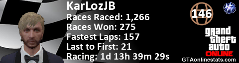 [URL=http://GTAonlinestats.com/showplayer/KarLozJB/2][IMG]http://GTAonlinestats.com/racesignature/KarLozJB/2/sig.png[/IMG][/URL]