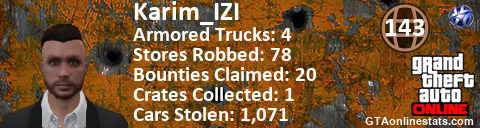 [URL=http://GTAonlinestats.com/showplayer/Karim_IZI][IMG]http://GTAonlinestats.com/crimesignature/Karim_IZI/sig.png[/IMG][/URL]