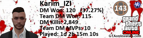 [URL=http://GTAonlinestats.com/showplayer/Karim_IZI][IMG]http://GTAonlinestats.com/dmsignature/Karim_IZI/sig.png[/IMG][/URL]