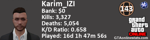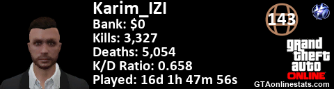 [URL=http://GTAonlinestats.com/showplayer/Karim_IZI][IMG]http://GTAonlinestats.com/greysignature/Karim_IZI/sig.png[/IMG][/URL]