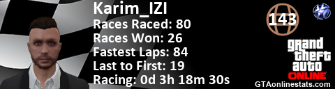 [URL=http://GTAonlinestats.com/showplayer/Karim_IZI][IMG]http://GTAonlinestats.com/racesignature/Karim_IZI/sig.png[/IMG][/URL]