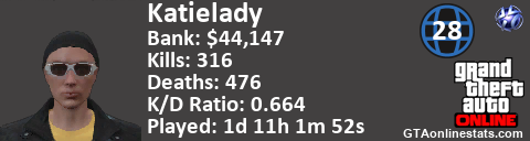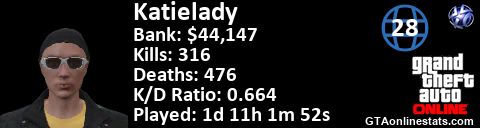 [URL=http://GTAonlinestats.com/showplayer/Katielady][IMG]http://GTAonlinestats.com/signature/Katielady/sig.png[/IMG][/URL]