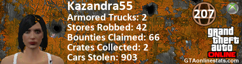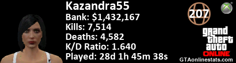 <a href="http://GTAonlinestats.com/showplayer/Kazandra55"><img src="http://GTAonlinestats.com/randomsignature/Kazandra55/sig.png" alt="Kazandra55" border="0" /></a>