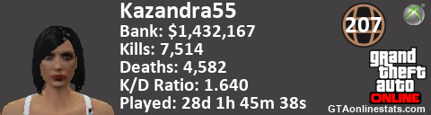 <a href="http://GTAonlinestats.com/showplayer/Kazandra55"><img src="http://GTAonlinestats.com/signature/Kazandra55/sig.png" alt="Kazandra55" border="0" /></a>