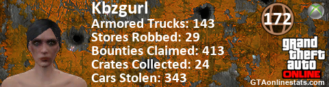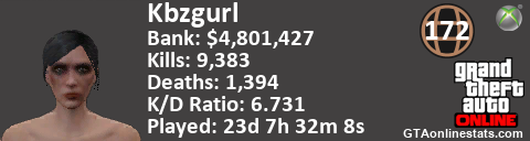 [URL=http://GTAonlinestats.com/showplayer/Kbzgurl][IMG]http://GTAonlinestats.com/signature/Kbzgurl/sig.png[/IMG][/URL]