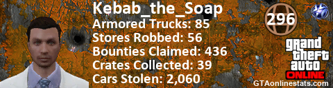 [URL=http://GTAonlinestats.com/showplayer/Kebab_the_Soap][IMG]http://GTAonlinestats.com/randomsignature/Kebab_the_Soap/sig.png[/IMG][/URL]
