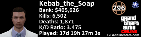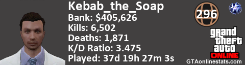 [URL=http://GTAonlinestats.com/showplayer/Kebab_the_Soap][IMG]http://GTAonlinestats.com/signature/Kebab_the_Soap/sig.png[/IMG][/URL]