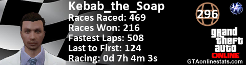[URL=http://GTAonlinestats.com/showplayer/Kebab_the_Soap][IMG]http://GTAonlinestats.com/racesignature/Kebab_the_Soap/sig.png[/IMG][/URL]