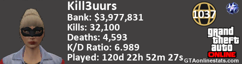 <a href="http://GTAonlinestats.com/showplayer/Kill3uurs"><img src="http://GTAonlinestats.com/randomsignature/Kill3uurs/sig.png" alt="Kill3uurs" border="0" /></a>