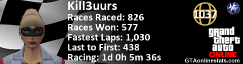 [URL=http://GTAonlinestats.com/showplayer/Kill3uurs][IMG]http://GTAonlinestats.com/racesignature/Kill3uurs/sig.png[/IMG][/URL]