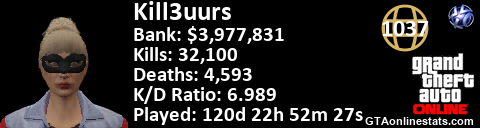 [URL=http://GTAonlinestats.com/showplayer/Kill3uurs][IMG]http://GTAonlinestats.com/signature/Kill3uurs/sig.png[/IMG][/URL]