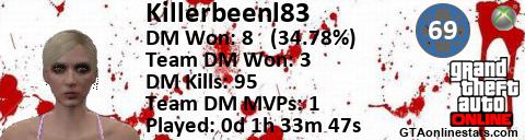 [URL=http://GTAonlinestats.com/showplayer/Killerbeenl83/2][IMG]http://GTAonlinestats.com/dmsignature/Killerbeenl83/2/sig.png[/IMG][/URL]