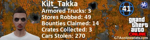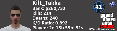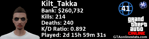 [URL=http://GTAonlinestats.com/showplayer/Kilt_Takka][IMG]http://GTAonlinestats.com/signature/Kilt_Takka/sig.png[/IMG][/URL]