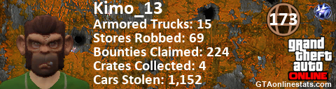 [URL=http://GTAonlinestats.com/showplayer/Kimo_13][IMG]http://GTAonlinestats.com/crimesignature/Kimo_13/sig.png[/IMG][/URL]