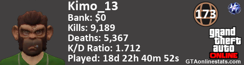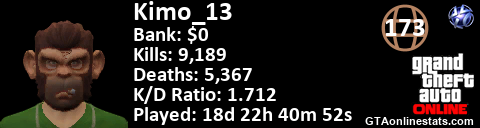 [URL=http://GTAonlinestats.com/showplayer/Kimo_13][IMG]http://GTAonlinestats.com/signature/Kimo_13/sig.png[/IMG][/URL]