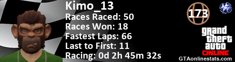 [URL=http://GTAonlinestats.com/showplayer/Kimo_13][IMG]http://GTAonlinestats.com/racesignature/Kimo_13/sig.png[/IMG][/URL]