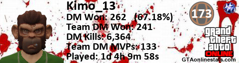 [URL=http://GTAonlinestats.com/showplayer/Kimo_13][IMG]http://GTAonlinestats.com/randomsignature/Kimo_13/sig.png[/IMG][/URL]