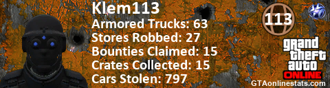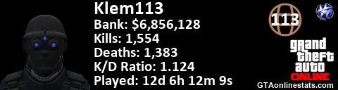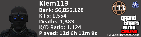 <a href="http://GTAonlinestats.com/showplayer/Klem113"><img src="http://GTAonlinestats.com/crimesignature/Klem113/sig.png" alt="Klem113" border="0" /></a>