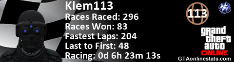 <a href="http://GTAonlinestats.com/showplayer/Klem113"><img src="http://GTAonlinestats.com/racesignature/Klem113/sig.png" alt="Klem113" border="0" /></a>