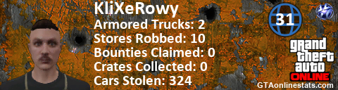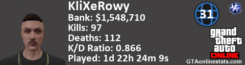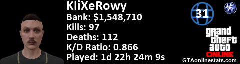 <a href="http://GTAonlinestats.com/showplayer/KliXeRowy"><img src="http://GTAonlinestats.com/signature/KliXeRowy/sig.png" alt="KliXeRowy" border="0" /></a>