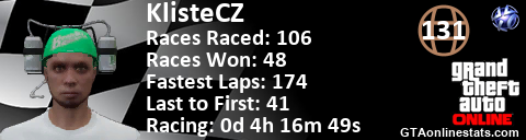 [URL=http://GTAonlinestats.com/showplayer/KlisteCZ][IMG]http://GTAonlinestats.com/racesignature/KlisteCZ/sig.png[/IMG][/URL]