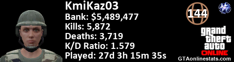 <a href="http://GTAonlinestats.com/showplayer/KmiKaz03"><img src="http://GTAonlinestats.com/dmsignature/KmiKaz03/sig.png" alt="KmiKaz03" border="0" /></a>