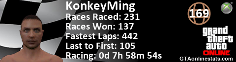 <a href="http://GTAonlinestats.com/showplayer/KonkeyMing"><img src="http://GTAonlinestats.com/racesignature/KonkeyMing/sig.png" alt="KonkeyMing" border="0" /></a>