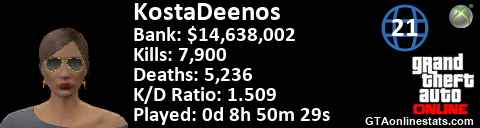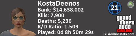 <a href="http://GTAonlinestats.com/showplayer/KostaDeenos/2"><img src="http://GTAonlinestats.com/dmsignature/KostaDeenos/2/sig.png" alt="KostaDeenos" border="0" /></a>