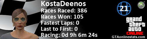 [URL=http://GTAonlinestats.com/showplayer/KostaDeenos/2][IMG]http://GTAonlinestats.com/racesignature/KostaDeenos/2/sig.png[/IMG][/URL]