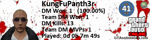 [URL=http://GTAonlinestats.com/showplayer/KungFuPanth3r][IMG]http://GTAonlinestats.com/signature/KungFuPanth3r/sig.png[/IMG][/URL]
