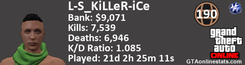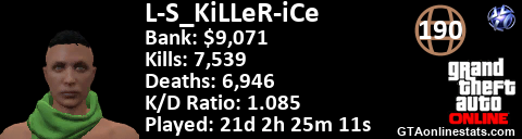 <a href="http://GTAonlinestats.com/showplayer/L-S_KiLLeR-iCe"><img src="http://GTAonlinestats.com/signature/L-S_KiLLeR-iCe/sig.png" alt="L-S_KiLLeR-iCe" border="0" /></a>