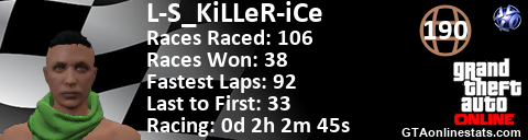 [URL=http://GTAonlinestats.com/showplayer/L-S_KiLLeR-iCe][IMG]http://GTAonlinestats.com/racesignature/L-S_KiLLeR-iCe/sig.png[/IMG][/URL]
