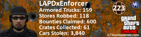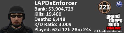 [URL=http://GTAonlinestats.com/showplayer/LAPDxEnforcer][IMG]http://GTAonlinestats.com/signature/LAPDxEnforcer/sig.png[/IMG][/URL]